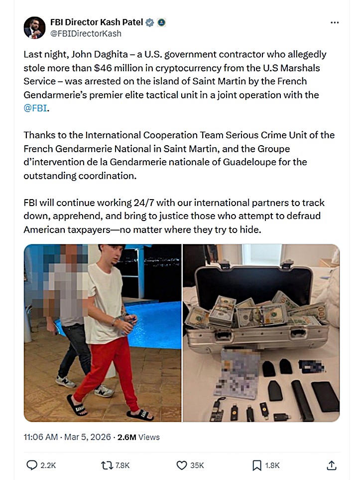 FBI Director Kash Patel confirmed on Thursday that the suspect wanted in connection with the alleged theft of more than US $46 million in cryptocurrency from the United States Marshals Service was arrested on St. Martin during a joint international law enforcement operation.